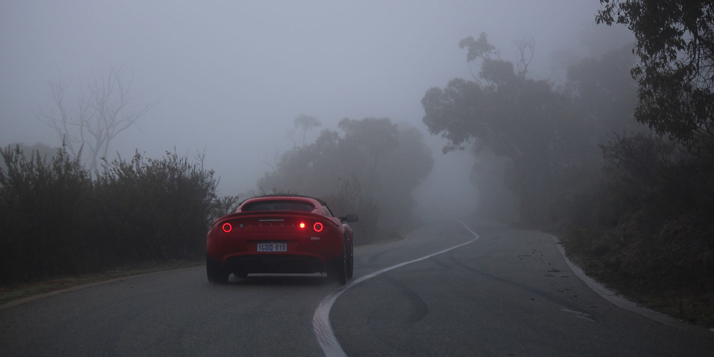 Adrian and Lena were the nominated run leaders for the day in their red Elise 220 and led the five Lotuses on a route heading out from Guildford up to the Perth hills. The climb up towards Darlington saw the group enveloped in a low lying light mist, which was to accompany us for the majority of the run. Notwithstanding, we wound our way up to the top of Mundaring Weir for a stop at the dam wall for a quick photo call.