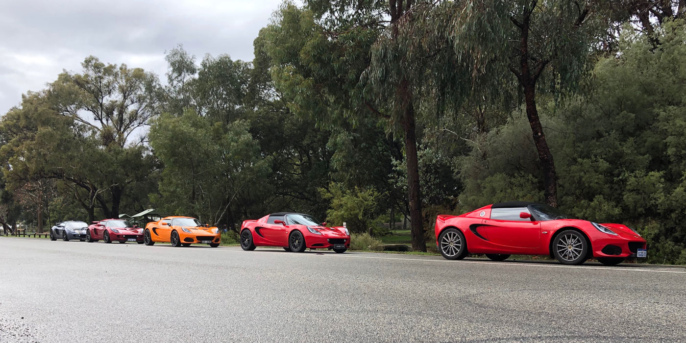 The decidedly dank Norfolk Broads weather system persisted until we emerged from Darlington and crossed the Great Eastern highway to enter the John’s Forrest national park access road. Slightly better conditions were starting to prevail, but the sight of the brightly coloured Lotus convoy was a much more desirable photographic target for the brave tourists stationed at the national park lookout points!